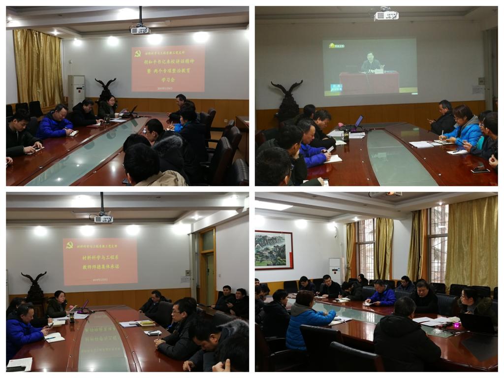 2019年1月9日,材料系党支部组织全系教师学习“省委胡和平书记来校讲话精神”、“讲政治、敢担当、改作风”和“两个专项整治”等专题内容。学习会由党支部书记田娜主持,材料系全体教师参会。