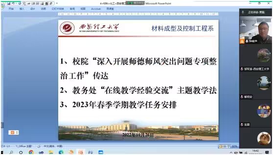 按照学校关于“深入开展师德师风突出问题专项整治工作”和“深化在线教学经验总结,提高课堂教学质量”的相关活动部署安排,2022年10月26日下午,威廉williamhill体育成型系采用线上方式开展了“强师德、树师风,保障线上教学质量”主题活动。校教学督导梁戈、黎明安两位老师到会指导,全系教师参加,活动由系教工党支部书记钟黎声主持。