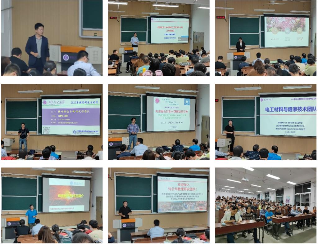 贾磊教授、徐春杰教授、张乔副教授、李继红副教授、钟黎声教授分别代表先进复合材料与摩擦学团队、增材制造与精确成形团队、电工材料与熔渗技术团队、焊接研究室、许云华教授团队等学科科研团队进行了宣讲。就各团队的研究领域、培养方向、研究成果和团队发展等进行了讲述,展示了历届研究生在科学研究、论文发表、学业获奖、毕业去向等方面的成果和风采。
