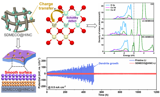 金属锂基电池因其高比容量(3860 mA h g-1)和较低的标准电压(-3.04 Vvs.SHE)而备受关注。然而,锂金属电池的实际应用仍然面临严峻的挑战,如锂离子溶剂化后的不可控沉积导致锂枝晶生长,体积膨胀致使SEI的反复破裂和修复会不断消耗电解液,使电池的循环寿命缩短甚至出现严重的安全问题。基于此,公司游才印教授团队青年教师张静博士与中科院苏州纳米所蔺洪振研究员及德国亥姆赫兹电化学研究所王健博士(现为洪堡学者)合作,从表界面功能化角度出发,采用肖脱基缺陷调控氧化铈的4f中心电子结构(SDMECO@HINC),优化Li+去溶剂化和Li+扩散沉积,制备出无枝晶长寿命的锂金属电池。研究成果以“Tuning 4f-center Electron Structure by Schottky Defects for Catalyzing Li Diffusion to Achieve Long-term Dendrite-free Lithium Metal Battery”为题发表在国际知名期刊Advanced science。