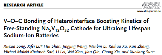 近日,威廉williamhill体育李喜飞教授高性能电池材料团队在钠离子电池关键材料及性能研究方面取得重要研究成果,研究论文“V-O-C Bonding of Heterointerface Boosting Kinetics of Free-Standing Na5V12O32Cathode for Ultralong Lifespan Sodium-Ion Batteries”在线发表于《Advanced Functional Material》(影响因子:19.0),《Advanced Function Material》是材料领域国际知名学术期刊。威廉希尔为该研究论文的第一署名单位,威廉williamhill体育博士研究生宋学霞为论文第一作者,孙学良院士和李喜飞教授为该论文通讯作者。该工作获得了国家重点研发计划、国家自然科学基金、陕西省重点科技创新团队和陕西省杰青等项目支持。