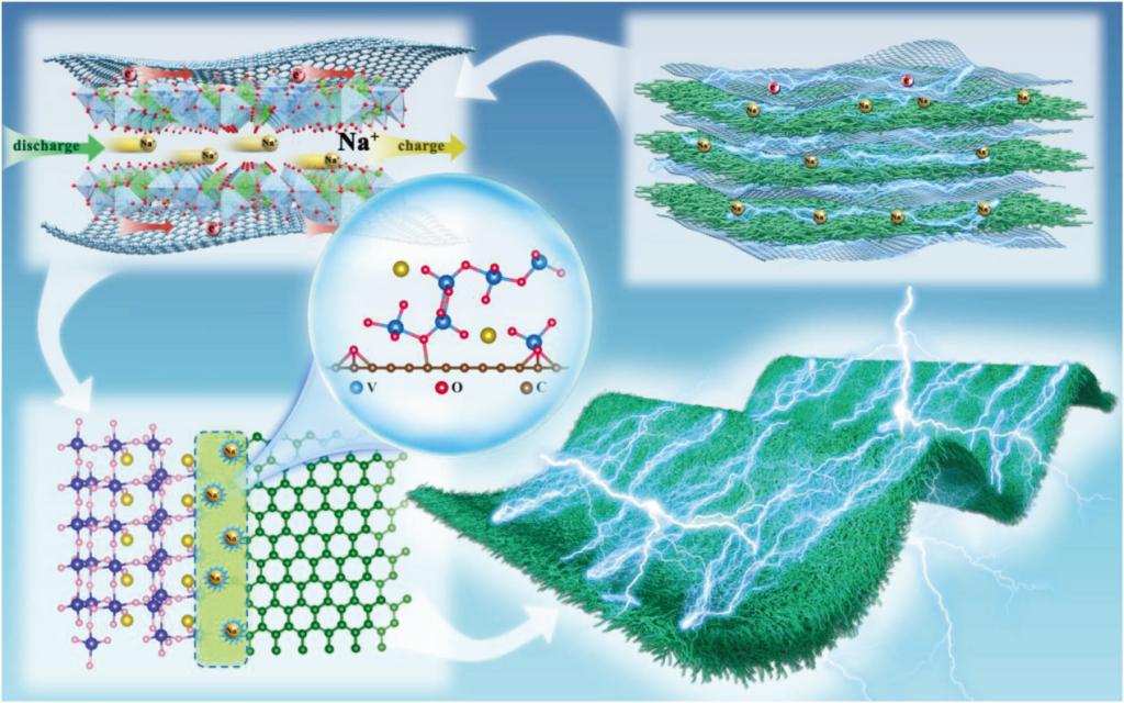 伴随着电动汽车和移动电子产品的快速发展,亟需开发高能量密度、长循环寿命的储能电池。开发具有高能量密度的柔性自支撑正极对可穿戴钠离子电池来说是一个挑战。钒基材料因其多价态和具有可调节的离子扩散通道而得到了广泛的研究,层状钒氧化物正极由于其理论容量高,结构稳定性好,成本低,作为钠离子电池正极材料表现出巨大的潜力。然而,它们的实际应用受到了其结构的不稳定和缓慢的扩散动力学的限制。要实现能够充分利用其高容量贡献,同时提升动力学属性的“双赢”策略,对开发具有实用前景的高性能层状氧化物钠电正极至关重要。这将依赖于界面相互作用的精心设计,界面的相互作用支配控制着复合电极的动力学和传输过程,从而获得增强的化学稳定性、电导率的提升和机械性能改善的复合电极。