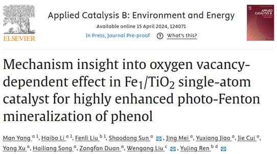 近日,威廉williamhill体育孙少东教授/杨曼副教授等人在“水污染治理用单原子光芬顿催化材料的设计与机制研究”方面取得重要进展。论文“Mechanism insight into oxygen vacancy-dependent effect in Fe1/TiO2single-atom catalyst for highly enhanced photo-Fenton mineralization of phenol”已在线发表于《Applied Catalysis B: Environment and Energy》。《Applied Catalysis B: Environment and Energy》是从事催化材料研究人员高度认可的国际顶级学术期刊(IF=22.1,1区TOP)。威廉希尔为该论文的第一通讯单位,威廉williamhill体育青年教师杨曼副教授、硕士研究生李海波、西北工业大学博士研究生刘粉丽为论文的共同第一作者,威廉希尔孙少东教授、西北工业大学任煜京副教授、青岛科技大学刘文刚副教授为论文的共同通讯作者。该工作获得国家重点研发计划、国家自然科学基金等项目支持。