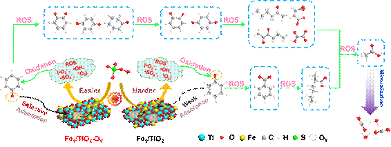 在光芬顿降解苯酚反应中,单原子金属被认为是汇聚光生电子促进ROS生成的有效活性位点。然而,光生电子随机转移导致的电子-空穴对复合会显著降低其利用效率,因而目前光生电子的有效分离和定向传递仍然是一个相当大的挑战。研究表明:将载体表面的氧空位(OV)作为电子陷阱,可以实现光生电子的定向传输和有效分离,并进一步驱动光生电子从氧空位转移到邻近的金属单原子位点。此外,引入金属单原子和氧空位均可形成杂质能级来缩小带隙,有利于提高光子吸收和电荷分离效率。基于此,本文通过在含有氧空位的TiO2表面生长铁单原子构建了Fe1/TiO2-OV催化剂,相比于在无氧空位TiO2表面负载铁单原子构建的Fe1/TiO2催化剂、无铁单原子的TiO2-OV催化剂,其苯酚氧化速率显著提升。通过原位光谱和密度泛函理论(DFT)计算,揭示了原子分散的Fe物种与氧空位之间的协同作用:(1)氧空位在光照下起到电子阱的作用,借助光生电子的定向传递调变Fe单位点的电子密度,从而高效生成ROS;(2)氧空位对苯酚分子的选择性吸附有利于后续的苯酚氧化矿化。本研究将为单原子光芬顿催化材料的优化改进提供新设计策略和理论参考。